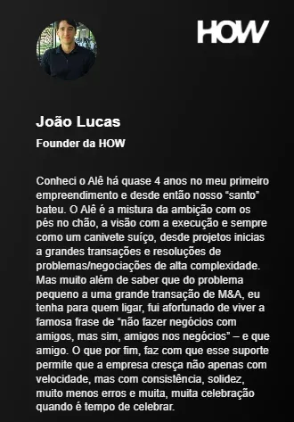 A participação de Ale Capella na jornada da HOW aparece como um dos pilares da construção da empresa. Segundo João Lucas, fundador da marca, a relação com Alê começou ainda em um empreendimento anterior, há quase quatro anos, e desde então se consolidou em uma parceria marcada por confiança, proximidade e capacidade real de resolução.