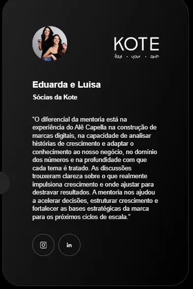 Como muitas marcas em crescimento acelerado, a KOTE chegou a um ponto onde a operação precisava de mais do que energia e criatividade: precisava de estrutura. Foi nesse momento que as sócias e irmãs, Eduarda e Luisa Lopes, decidiram buscar apoio externo para dar o próximo passo. E encontrou na mentoria para empreendedores de Alexandre Capella, a parceria ideal para redesenhar o plano de crescimento.